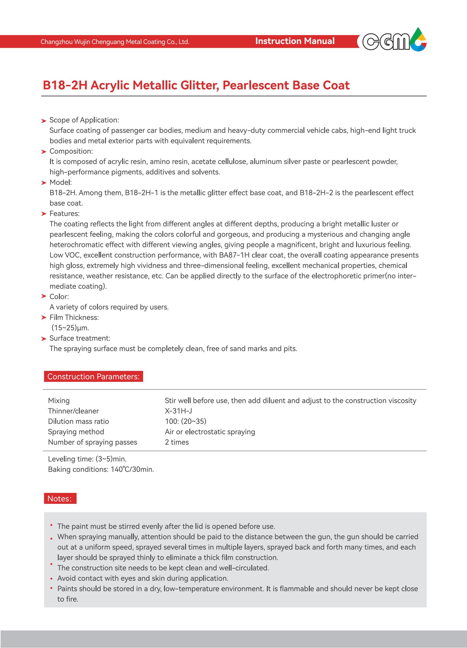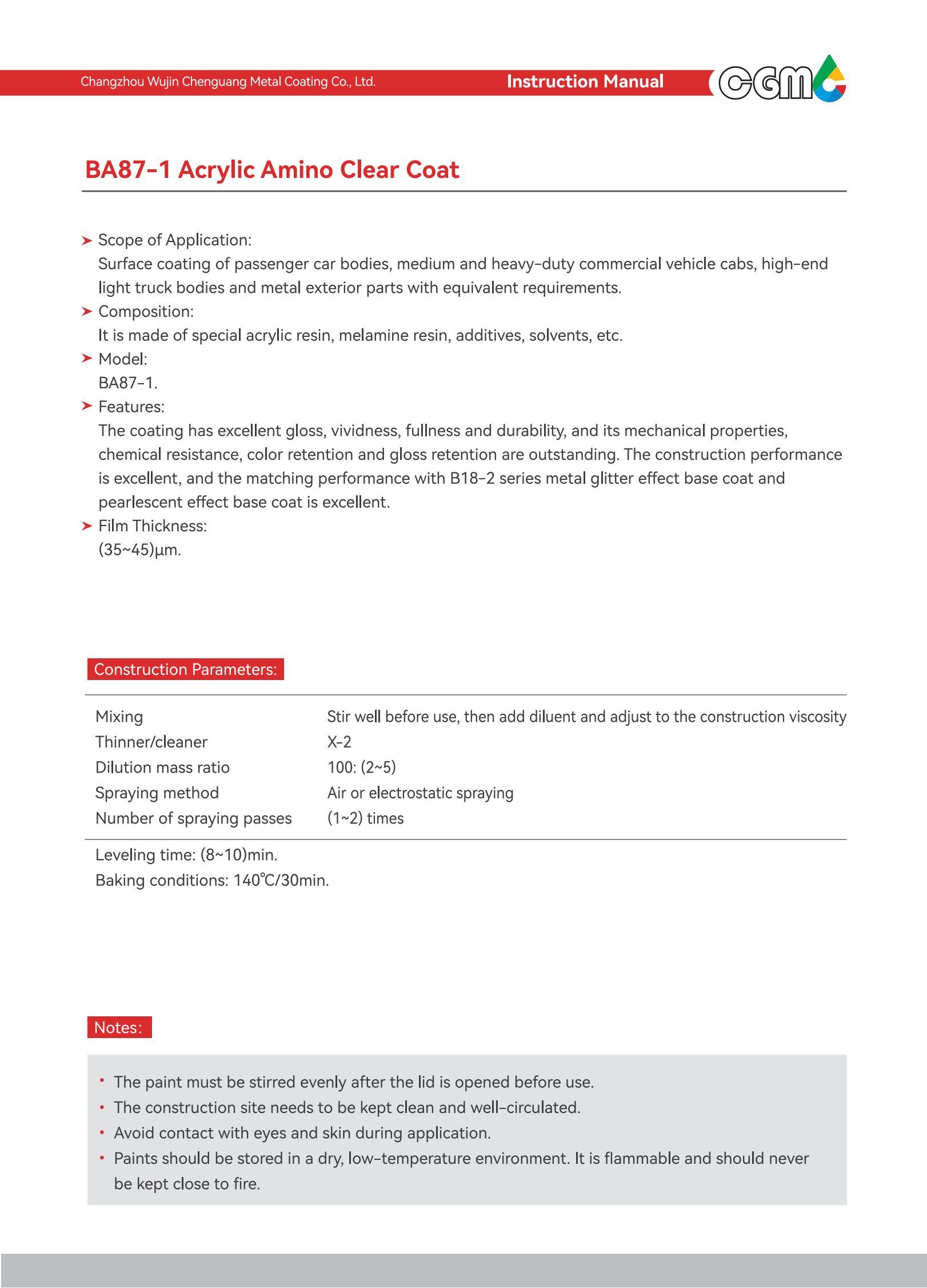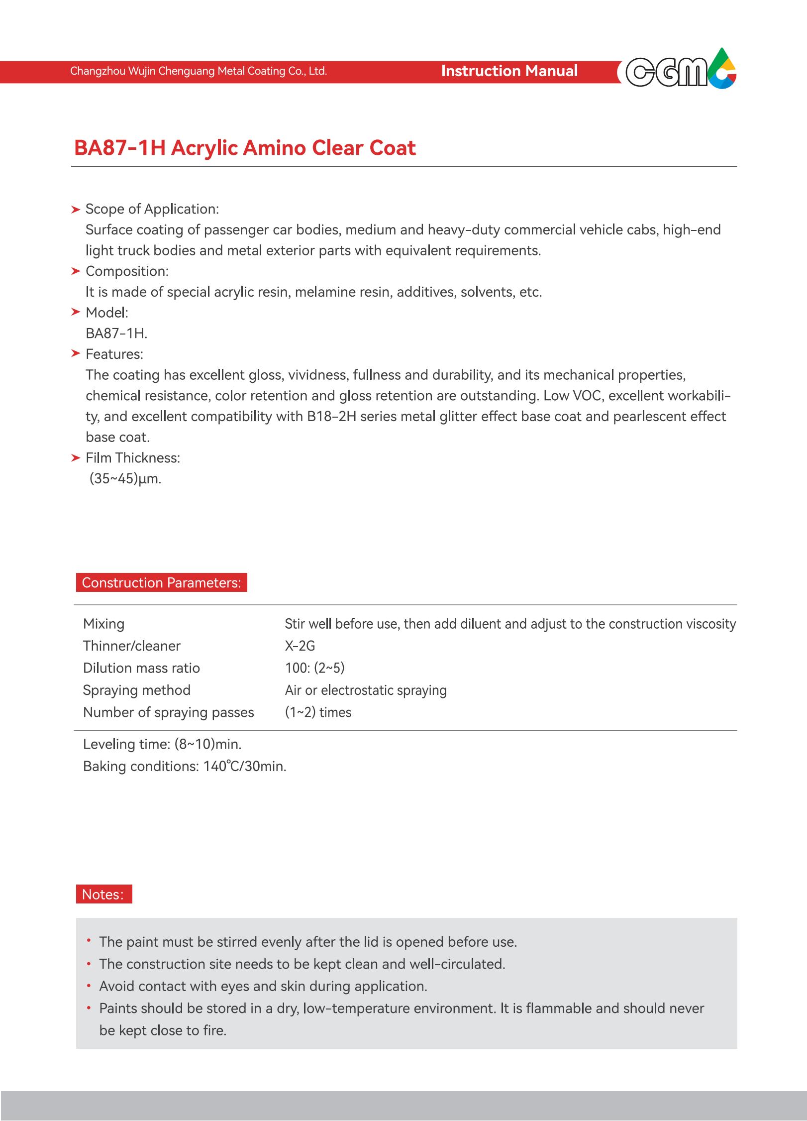 | Technical requirements | It meets the requirements of Q/CT-484 Automotive Paint Coating, an automotive industry standard, GB24409-2020 Limits of Hazardous Substances in Vehicle Coatings, and GB/T38597-2020 Technical Requirements for Coating Products with Low Volatile organic Compound Content. | |||||